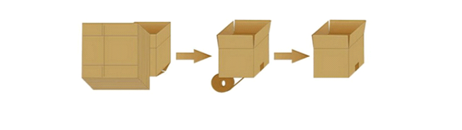 人工将纸箱存放到机器存储板上——>机器自动将纸箱拉开(吸盘式)成型——>自动折底部折页并开始封箱